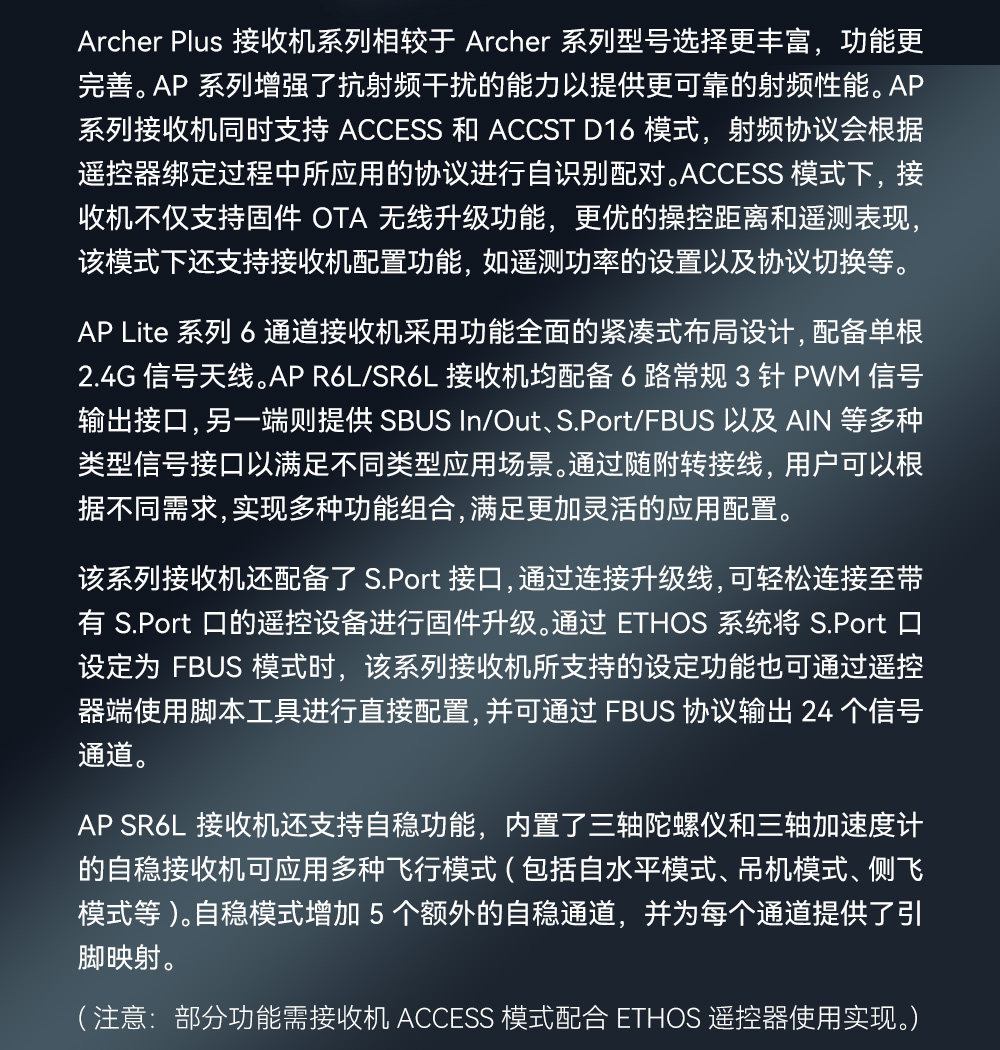 - 内置高精度遥测传感器(高度、垂直速度等)(Archer Plus SR6L)