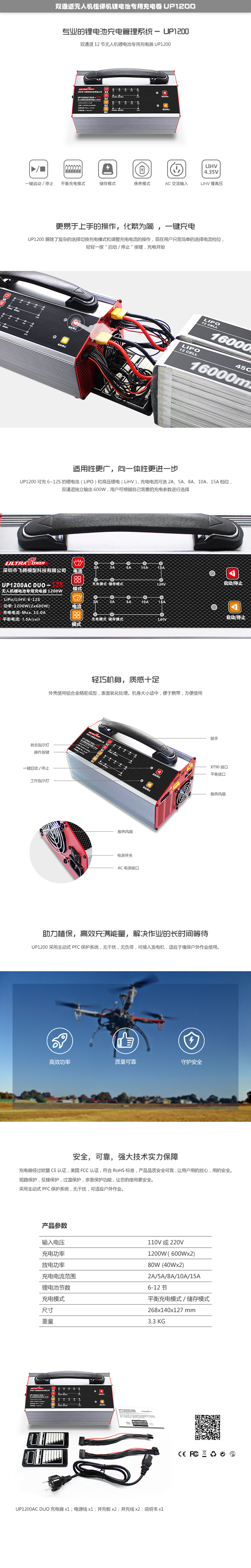 Ultra Power UP1200AC-DUO 双通道1200w 智能锂电池充电器(输入110V电压)