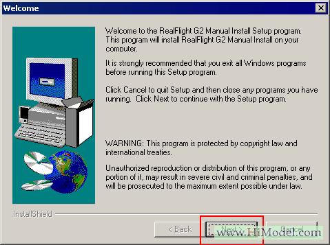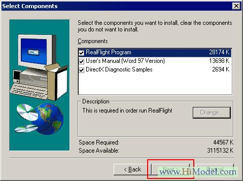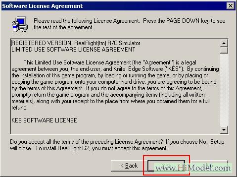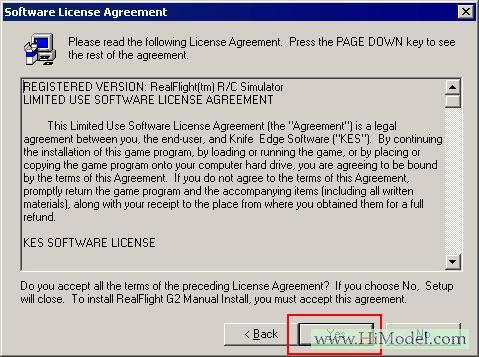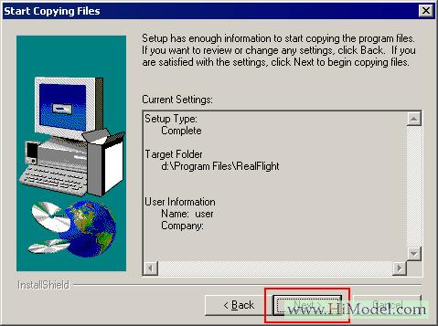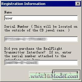 最下面的是用于激活RealFlight的接口的序号,如果你想使用RealFlight的接口来连接摇控器的话必须输入正确的序号,在软件或者接口的包装上可以找到这个序号,是象“XXXXXXX-RT-XXXXXX”这样的一串数字和字母的组合。输入正确的话对话框右下方的“Next>”会变成黑色,如果错误的话则该按钮是灰色不能点击的,安装不能继续。当然如果你不使用RealFlight的接口的话也可以不输入这个号码,同样可以安装软件,只是不能使用RealFlight提供的接口来连接摇控器。
