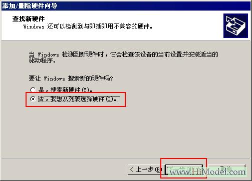 这里有两个选择,默认的选择是上面的那个,我们要选择下面的那个“否,我想从列表中选择硬件(O)”,然后点击“下一步(N)”