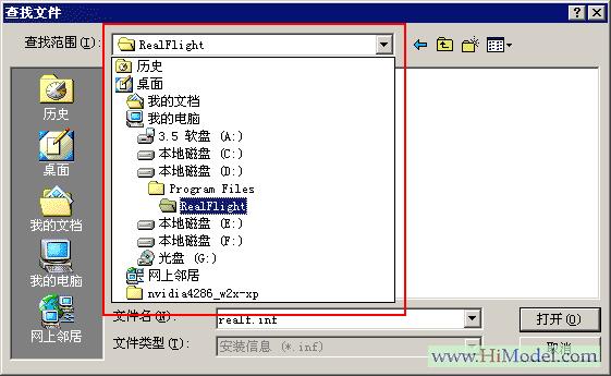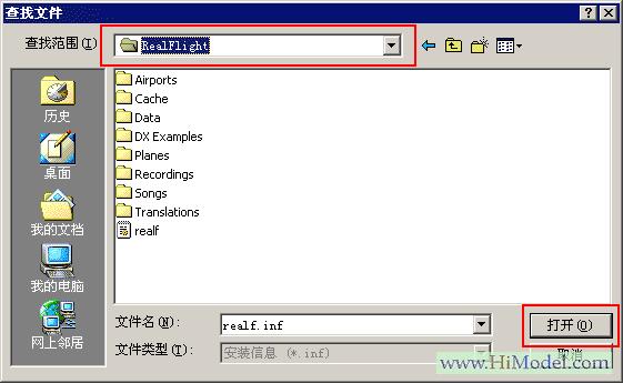 点击“浏览(B)”按钮后出现如下对话框,然后查找到RealFlight的安装目录,然后点击“打开(O)”