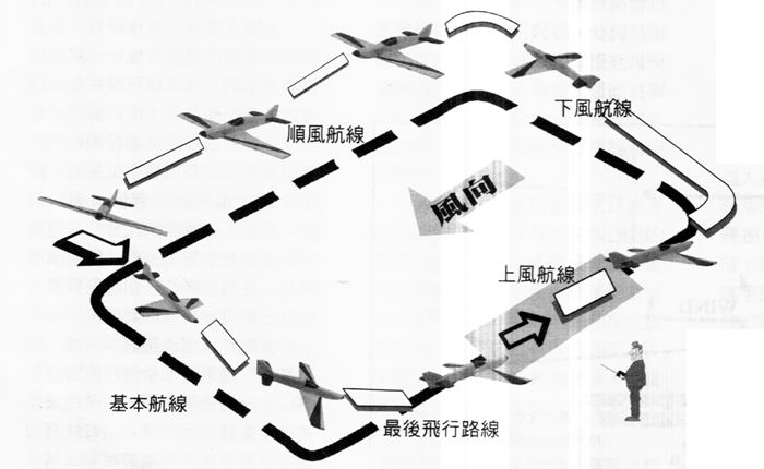 要进入降落的想像练习,首先要掌握现场的环境再进行。就像插图所表示的一样,自己要站在飞行场 所的哪一个地方,而风从哪一边吹来的呢?路线要从哪里开始呢?降落失败的话要如何避免危险才好呢!这些等等的因素就像山一样多,可是,如果能够 完整的掌握这些之後再来拿著遥控器,对初学者来说,在降落时的一些不安要素,应该已经可以去掉一大半了。