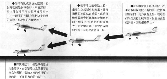 可是,像这样加大飞机的仰角,而使主翼的迎面增加的动作,如果在机体著地之前进行的话,就可以轻飘飘的接触到地面,而且在进入最後滑行的阶段,飞机的速度没有减弱时,也可以利用拉起升降舵(切记:严禁拉的过高!)来达到煞车的效果。