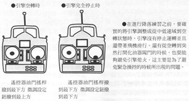因此,在飞行前还是让指导者来调整引擎,将遥控器上的油门摇杆拉到最下方时,旁边的微调设定钮则在上半段的范围内移动,这样就能够作细微的转数调整了,当然在微调设定钮移动最下方的时候,发动机一定得要停止才行。