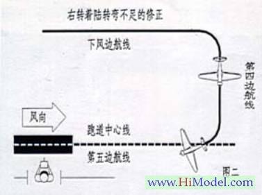 如果右转弯不足,通常会是机头偏向跑道中心线的外侧。纠正过程与之相反(图二)。