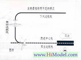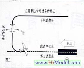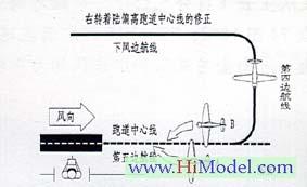 模型飞机的动力就是高度。在第五边航线飞行中,如果发现飞机下降过快,将风门推大就可以增加高度。同样如果迎面有风,也应将风门推大以增加动力,防止失速;风越强,风门也应开的越大。右转着陆偏离跑道中心线的修正模型飞机成功对准跑道,但有时飞行航线并未与跑道中心线平行,这时需要方向舵杆推向右侧,飞机就会往航线内侧方向靠近跑道中心线(图五A机)。反之亦然。(图五B机)。