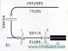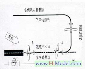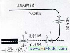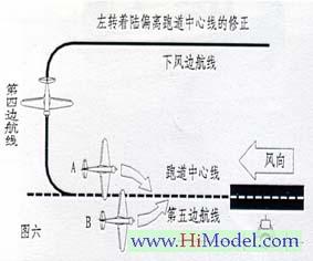 当模型飞机是以左转着陆方式进入第五边航线时,如果飞机是在跑道中心线的左侧,将方向舵杆推向右侧。(图六A机)反之亦然。(图六B机)。