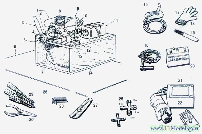 1.消音器 2.后桨垫 3.螺旋桨 4.前桨垫 5.螺旋桨固定螺帽 6.工作台 7.重物8.电热塞 9.由消音器引出的增压管 10.控制油门的摇臂 11.油箱 12.滤油器 13.夹持发动机的角铁 14.木框架,可用木板代替。木板一头装上发动机,另一头用螺钉固定在工作台上,井使螺旋桨旋转面离开工作台适当距离 15.加油用的手摇加油器,可用注射器代替 16.电热塞接线 17.拨动螺旋桨的用具 18.手套 19.一头有硬皮套的木棒 20.1.5伏电源 21.其他起动用具 22.12伏电源 23.电动起动器 24.电压表 25.安装螺旋桨和电热塞用的套筒扳手 26.其他常用工具 27.小刀 28.六角沉头扳手 29.螺丝刀 30.尖嘴钳