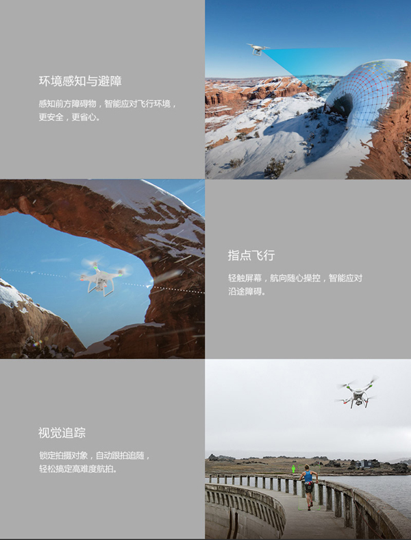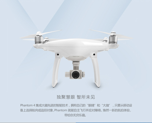 “大疆精灵Phantom 4的问世,标志着消费级无人机从此拥有了“视力”与“智力”,能够识别周边物体、判断飞行环境,并在一定条件下实现自主飞行。”