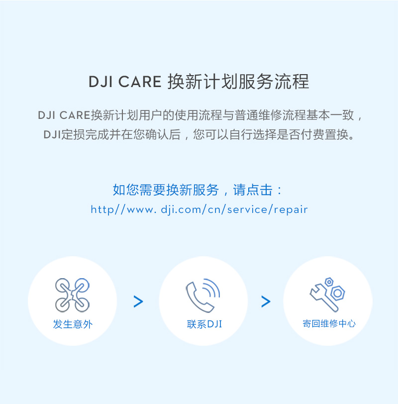专为高度集成Mavic打造的DJI Care换新计划助你安享随身无人机带来的畅快飞行体验,当您的Mavic发生意外时,DJI Care换新计划将为您提供一年两次的整机换新服务,每次换新需要支付一定的服务费,助您安心飞行。
