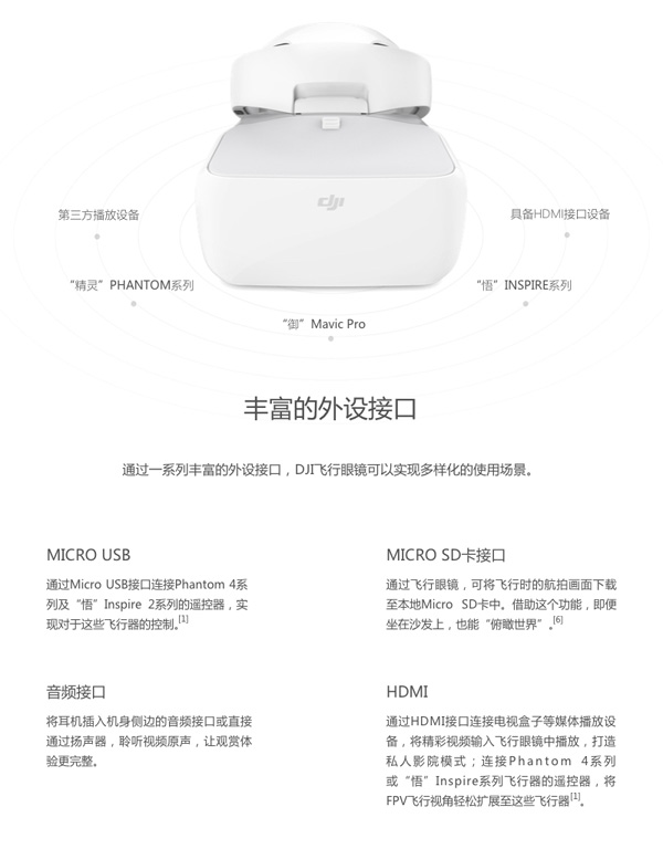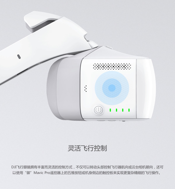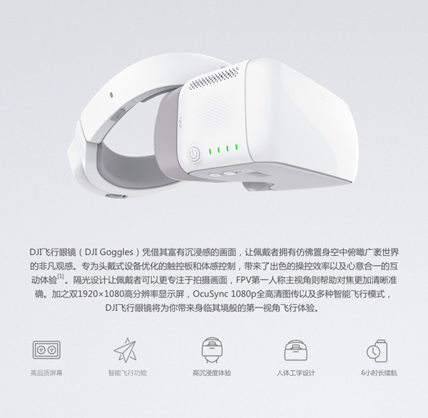 [1] DJI Goggles可支持“御”Mavic Pro, Phantom 4系列以及“悟”Inspire系列,具体功能会根据不同飞行器的特性有所调整。
