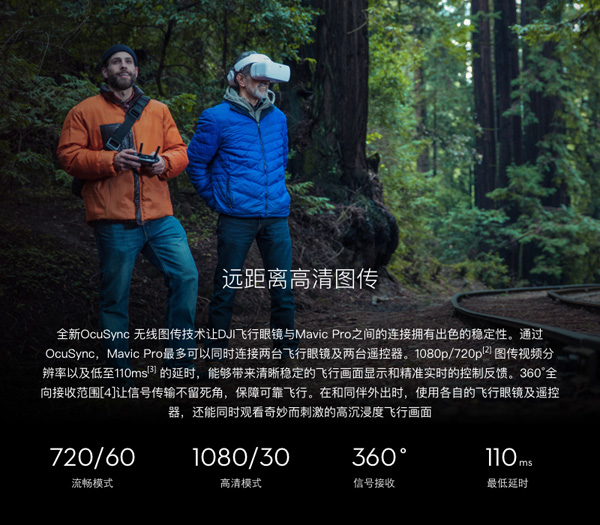 [3] 使用Mavic Pro在近场无干扰环境下,720p/60fps图传格式和720p/120fps的录像格式下测得。