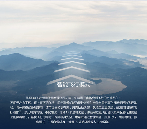 [4] DJI 飞行眼镜两根内置天线位于机身前方,另外两根则置于后方头带内部,提供了360°全向接收范围。同时,请遵守相关法律法规,并在佩戴DJI Goggles做FPV飞行时,务必有人陪同并在其视距范围内飞行。 [5] 固定翼模式不支持后退飞行。