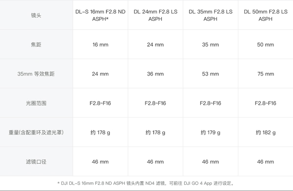 DJI DL/DL-S 镜头为航拍专业定焦镜头,采用轻量化的碳纤维定焦外壳,可有效减低云台负载,提高航拍稳定性。DL/DL-S 镜头适配DJI DL 卡口(58mm 口径),支持Zenmuse X7 云台相机,满足用户对不同镜头焦距的需求。当配合Zenmuse X7 云台相机时,若拍摄静态图片,焦距转换系数(CF)为1.5。