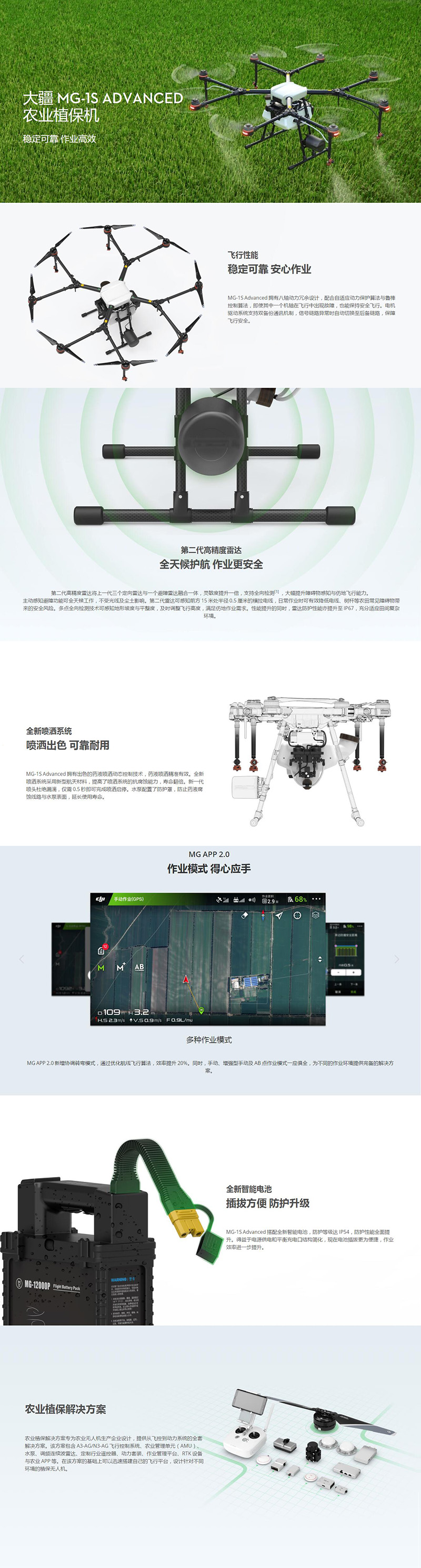 | 外形尺寸 | MG-1S Advanced:1460 mm×1460 mm×578 mm(机臂展开,不含螺旋桨) 780 mm×780 mm×578 mm(机臂折叠) |