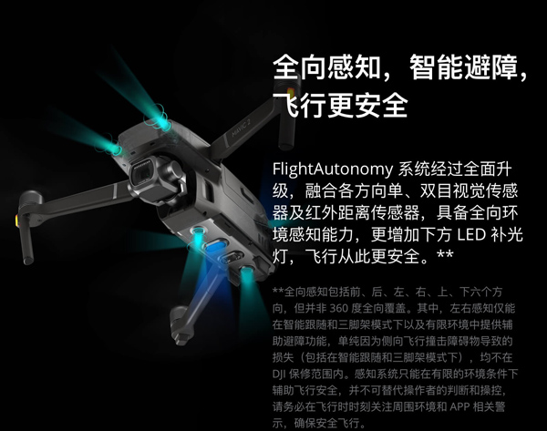 | 注解 | [1] 全向感知包括前、后、左、右、上、下六个方向,但并非 360 度全向覆盖。其中,左右感知仅能在智能跟随和三脚架模式下以及有限环境中提供辅助避障功能,单纯因为侧向飞行撞击障碍物导致的损失(包括在智能跟随和三脚架模式下),均不在 DJI 保修范围内。感知系统只能在有限的环境条件下辅助飞行安全,并不可替代操作者的判断和操控,请务必在飞行时时刻关注周围环境和 APP 相关警示,确保安全飞行。 |