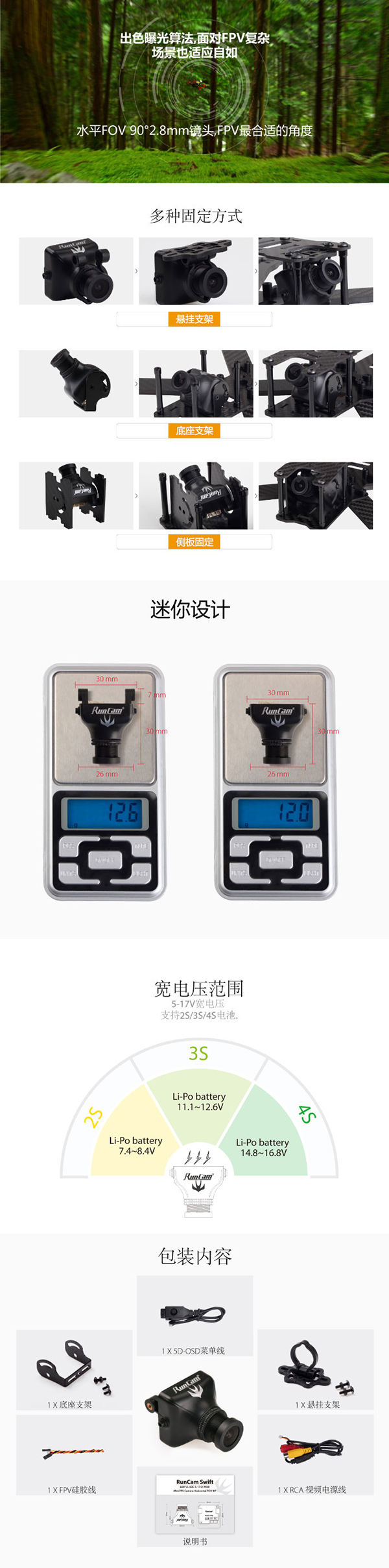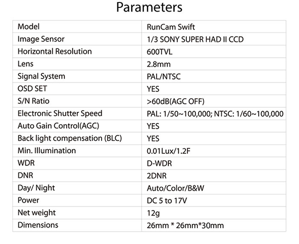 产品名称:RunCam Swift 90°广角 600线 FPV摄像头 / PAL DC5-17V输入