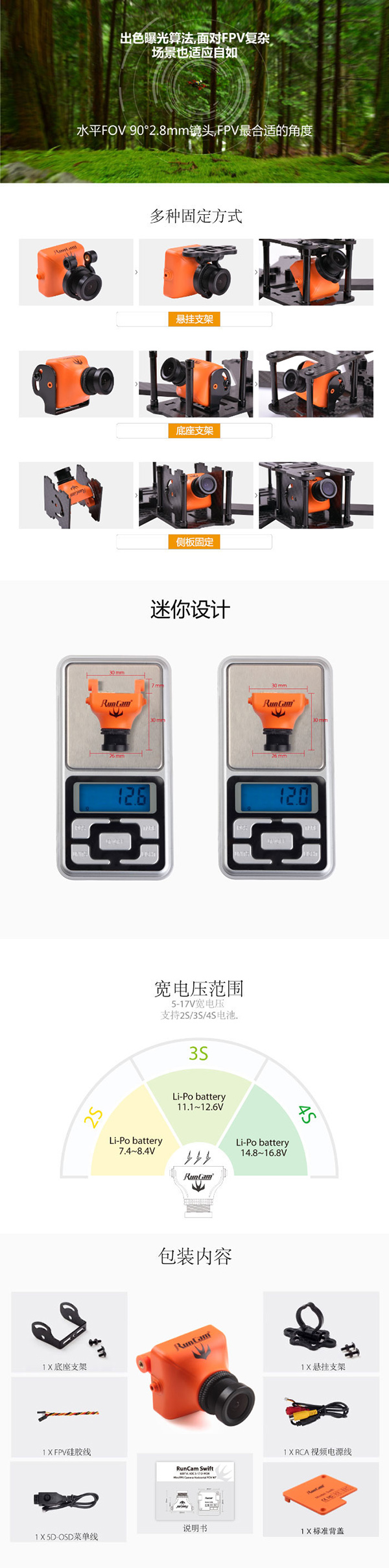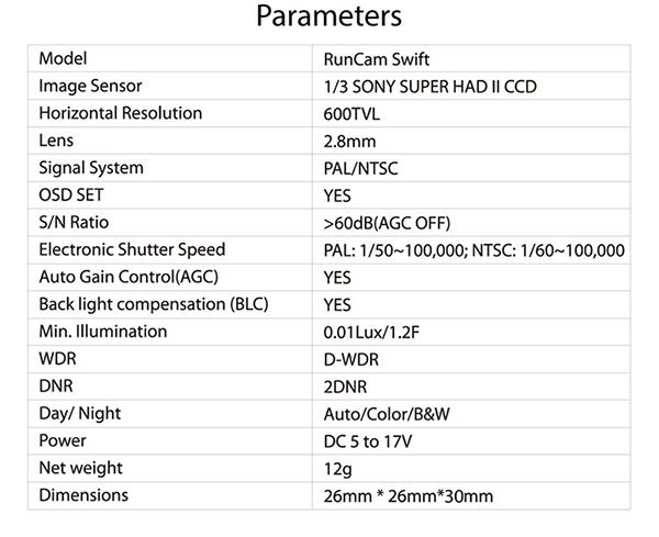 产品名称:RunCam Swift 雨燕 90°广角 600线 FPV摄像头 橙色款 / NTSC DC5-17V输入
