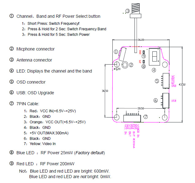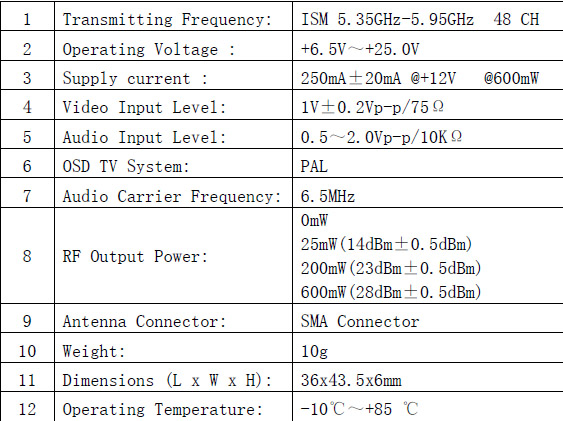 5.8G 48通道 25-600mw 可调 内置OSD 图传发射机 FT911