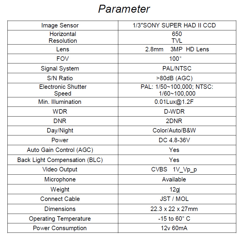 AOMWAY奥姆威 SONY 650线 迷你 FPV专用摄像头 / NTSC 内置OSD 5-35V电压输入