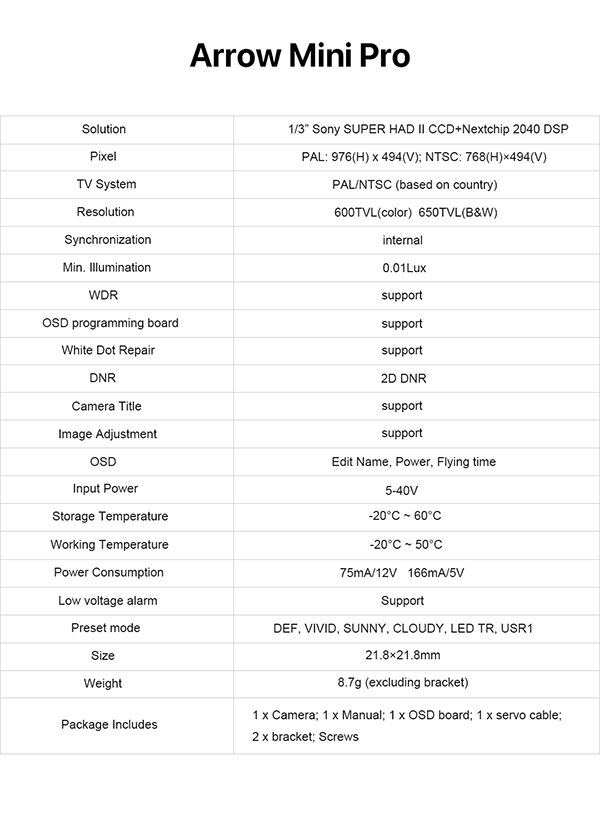 FOXEER Arrow mini Pro 2.5mm镜头 FPV 摄像头 黑色款 HS1207 / PAL