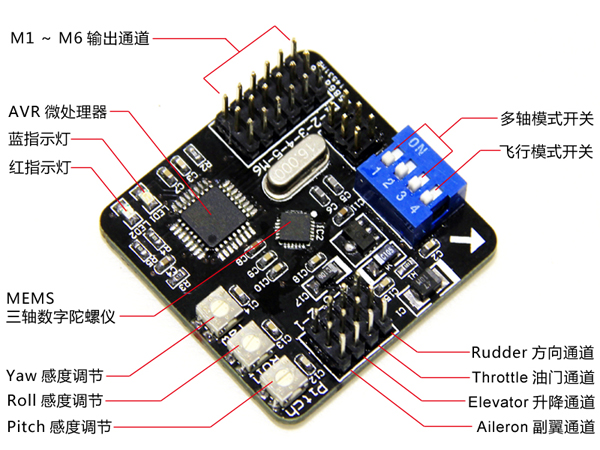 N6V2同时支持6种常见的多轴模式,每种模式均可选择普通或特技飞行模式,您可以通过板上的开关轻松进行切换。N6V2采用了高精度的MEMS数字三轴陀螺仪传感器,并且特别针对特技飞行的需要进行了算法优化,无论您是追求稳定的新手,还是追求刺激的高手,N6V2都能带给您出色的性能和表现!