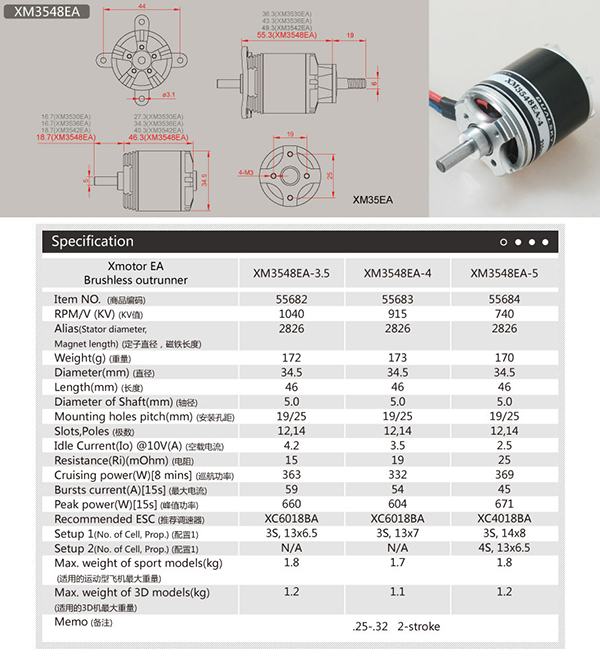 产品名称:双天 XM3548EA-4 915KV 固定翼用无刷外转子马达