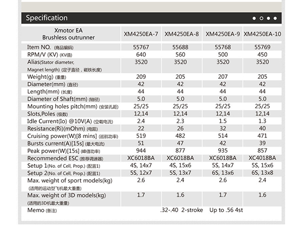 产品名称:双天 XM4250EA-7 640KV 固定翼用无刷外转子马达