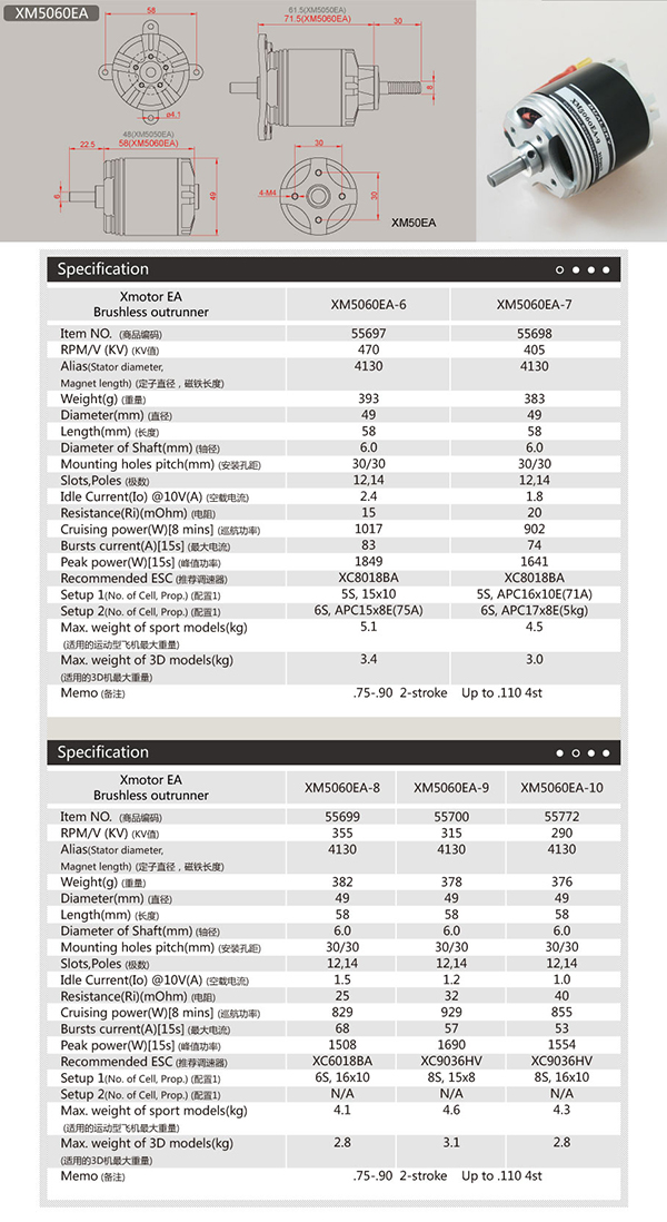 产品名称:双天 XM5060EA-7 405KV 固定翼用无刷外转子马达