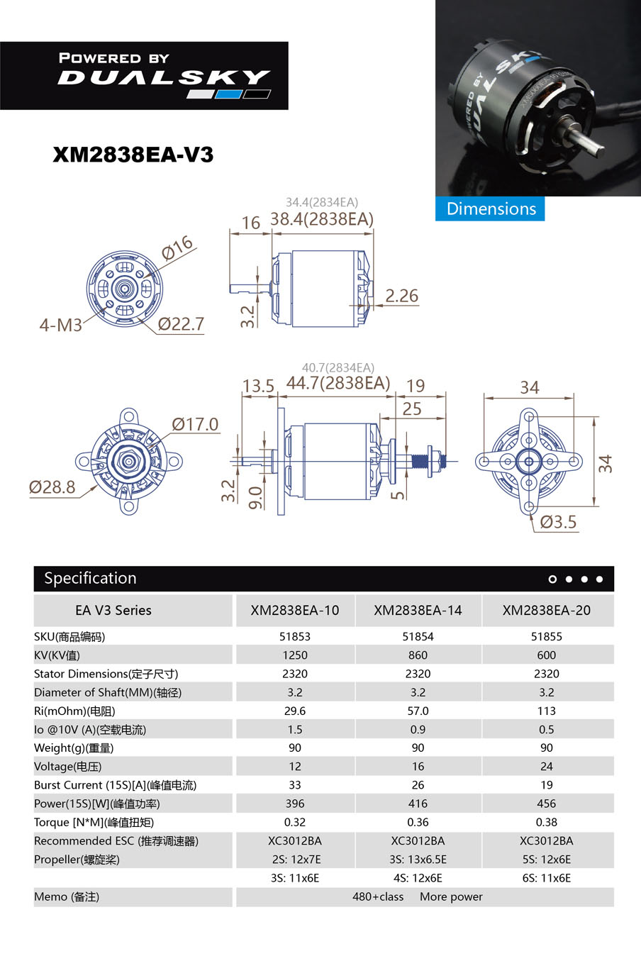 双天 XM2838EA-10 1250KV 3代 固定翼用无刷外转子马达