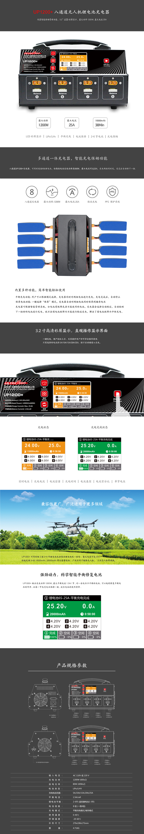 Ultra Power UP1200+ 8通道充电器1200W 智能锂电池充电器(输入110V电压)