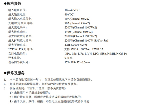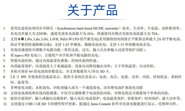 支持电池类型:LiPo. Lilo, LiFe. LiVH,LTO. NiZn NiMH, NiCd, Pb
