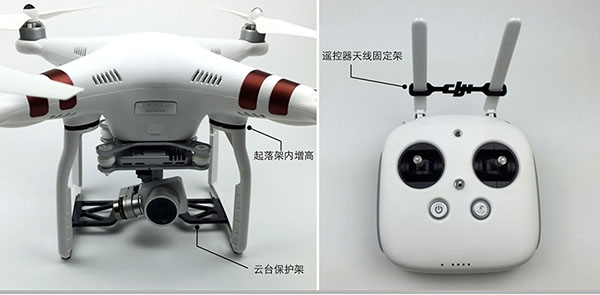 套装包含:起落架内增高配件、云台保护架、遥控器天线固定架,来保证更可靠、安全飞行。