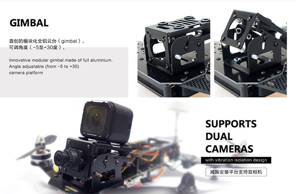 * 首创的模块化全铝云台(gimbal),可调角度(-5至+30度),减振安装平台支持双相机