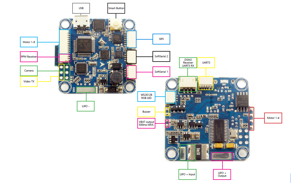 - STM32 F303 MCU, Runs Cleanflight firmware