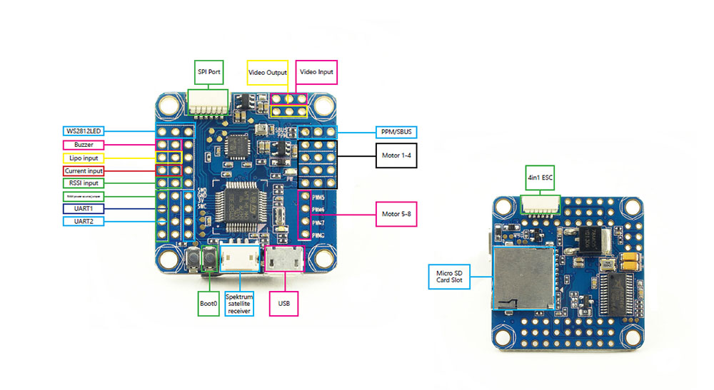 - 1-4路PWM电机输出接口为全功能2.54间距针孔,5-8路输出只提供信号输出脚,另备有1个SH1.0插座方便与四合一电调连接驱动1-4路电机
