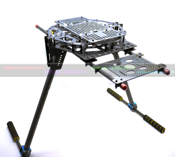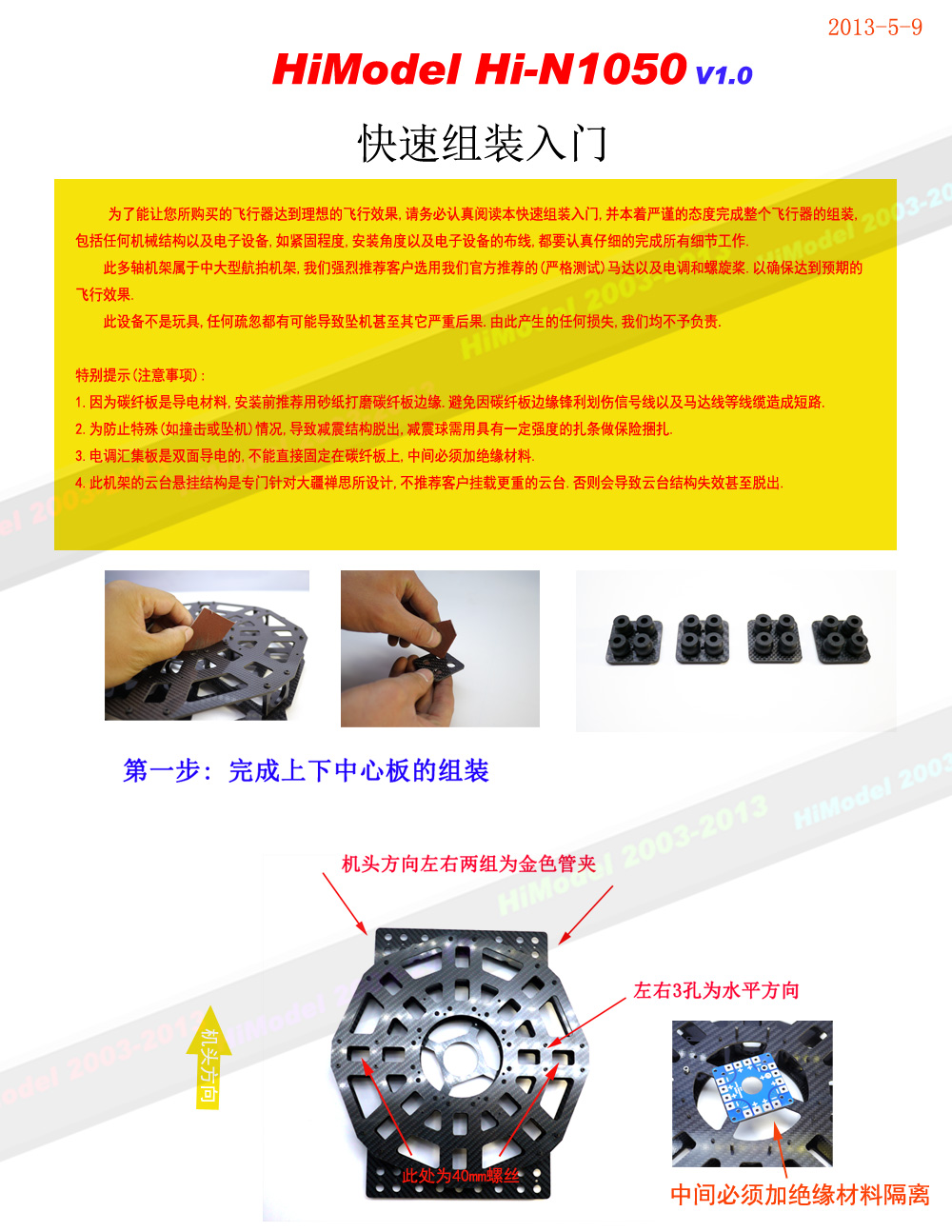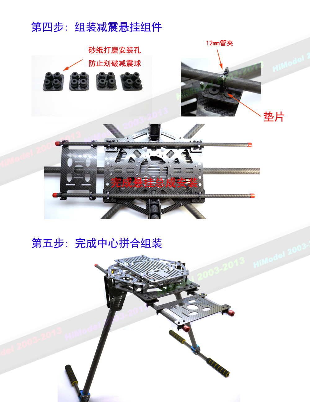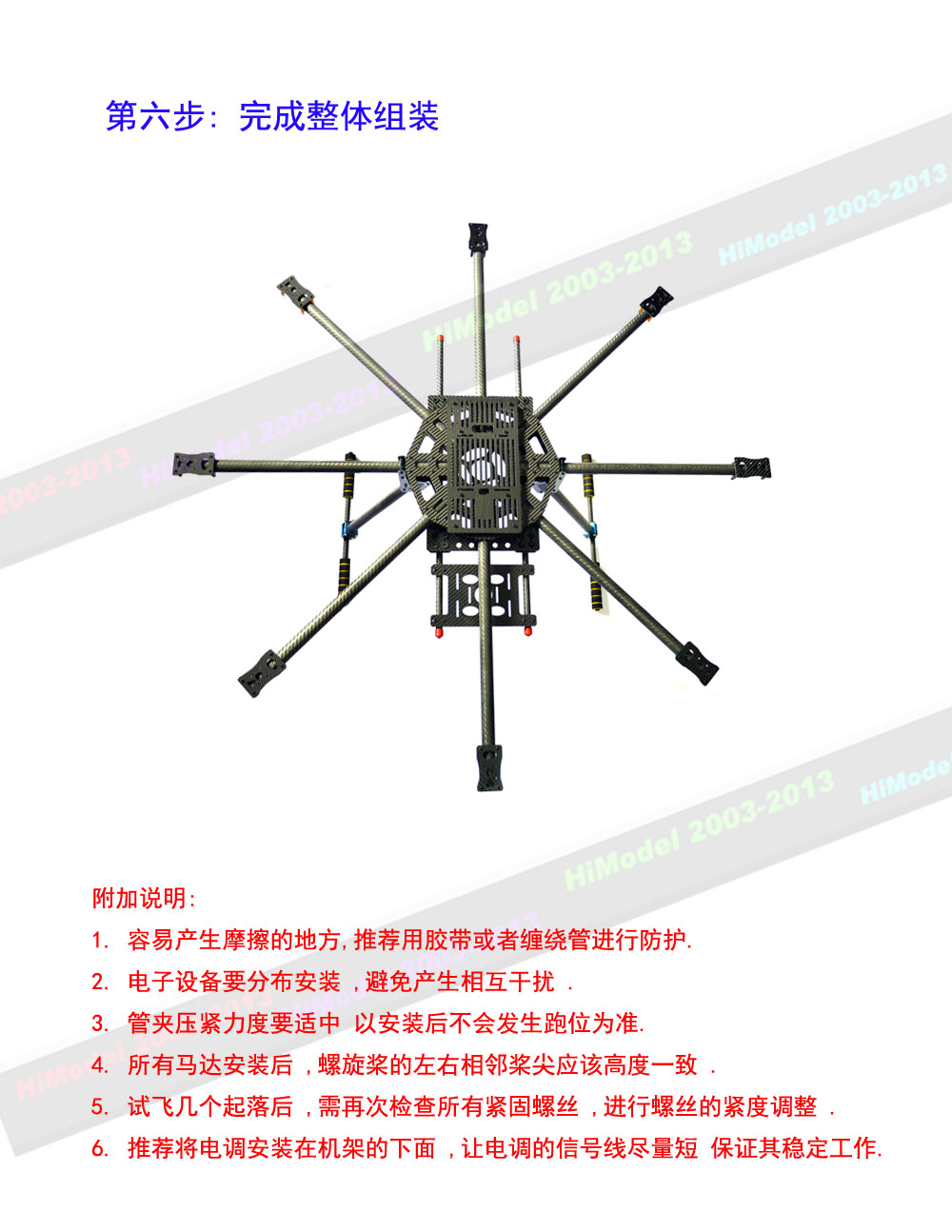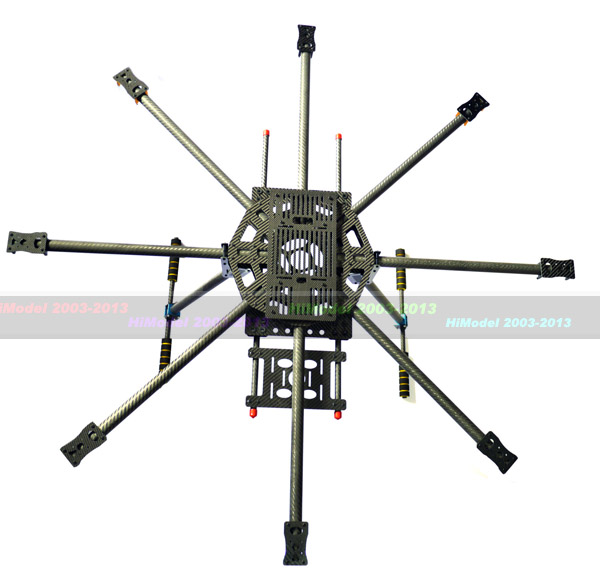 Hi-N1050多旋翼航拍机架,是HiModel经过数月设计和多次实拍测试完成的一款商业级专业八旋翼航拍机架,整机选用22mm的磨砂斜纹碳管.大尺寸28CM中心板设计,所有材料全部为3K全碳材质,(不含任何玻纤成份).高强度高脚腿设计,可稳定支撑大载重设备,针对悟空和禅思深度优化,云台和电子设备均具备二级减震,彻底杜绝因机架高频抖动导致的掉高度问题以及云台果冻问题.完美安装大疆悟空系统和禅思云台.整机设计双电池安装位,可同时安装 6S 20000mAh大容量电池.整机在设置成3.7V/S 报警电压时(9-9.5KG起飞重量),可具备长达15分钟的续航时间,足以完成各类大型航拍工程.