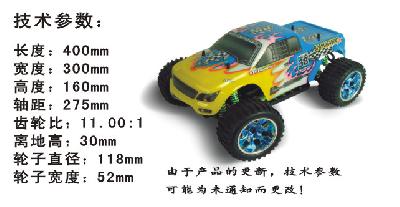 1/10比例升级版电池动力遥控大脚车造型美观,性能更加完美,为喜爱电车的模型爱好者量身设计.最近我们针对爱车模型者的切身需要又推出了94111PRO升级版,这款车除了拥有94111基本配置之外,我们还给它配置了新开发功能强大的无刷马达、无刷电调、避震器和超大容量的可再充电池,及各种颜色的金属轮框等配件。我们的电车对于模型者而言,是不可多得的电动模型产品.