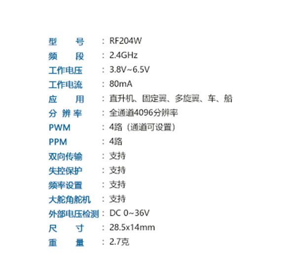 天地飞 2.4G 4通道 PPM 接收机 RF204W / 自带双向传输