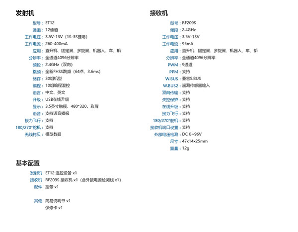 天地飞 2.4GHz ET12 十二通道 遥控器 + RF209S接收机套装 / 左手油门 默认中文界面