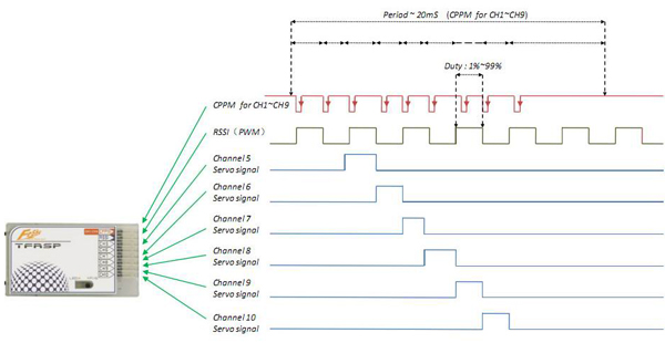 通道数:10个通道(CPPM CH1〜CH9,伺服信号通道CH5〜CH10)