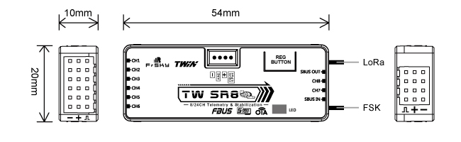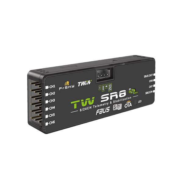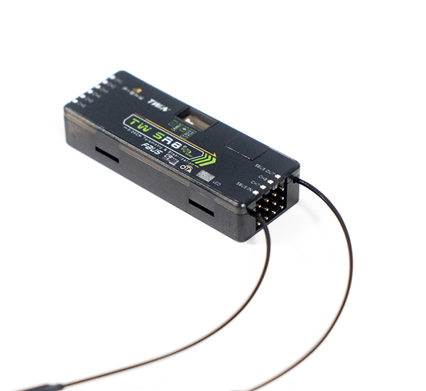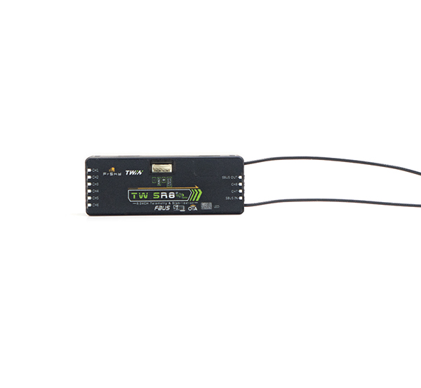 TW SR8接收器配备2根2.4G天线。信号接口包含SBUS输入/输出通道和8个PWM输出通道端口。该设备还支持通过FBUS/S.Port实现遥测功能。在ETHOS系统中将TW SR8设置为FBUS协议后,信号控制与遥测功能可通过单线连接至任意支持FBUS协议的设备,实现双向传输,同时减少布线数量简化模型构建。