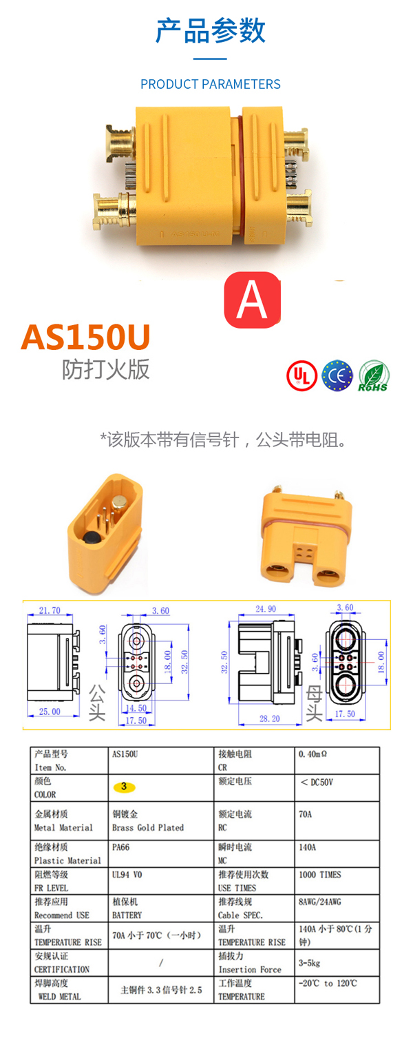 AMASS 艾迈斯 AS150U 公头(不含线) 插头 无人机锂电池连接器