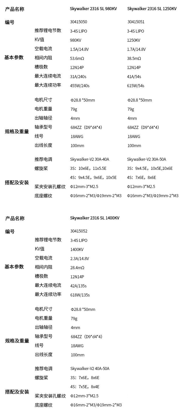 HobbyWing 好盈 天行者 Skywalker 2316SL 980kv 固定翼无刷电机