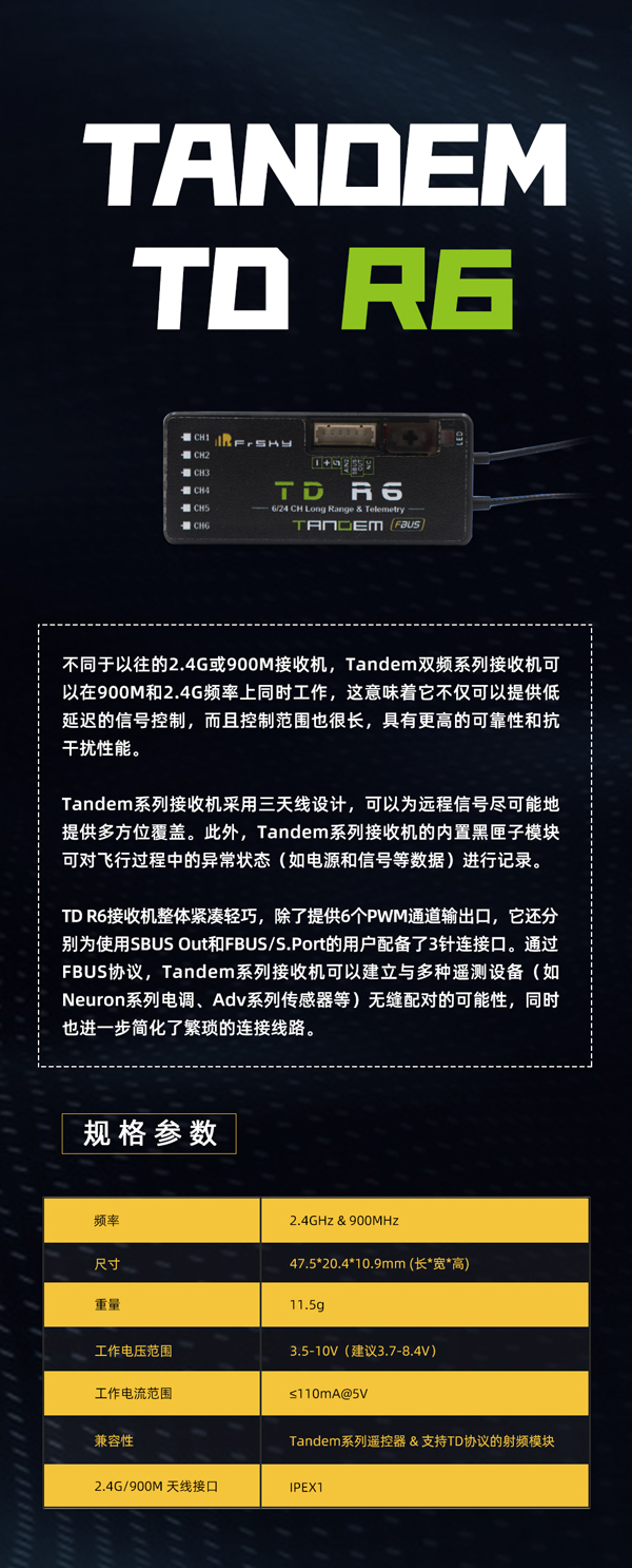 FrSky 睿思凯 TD R6 2.4GHz & 900MHz 双频接收机 6CH PWM通道