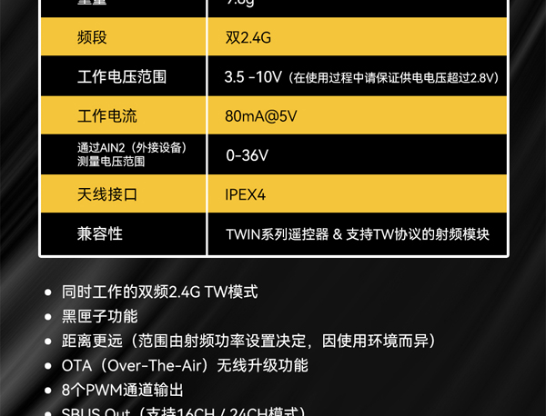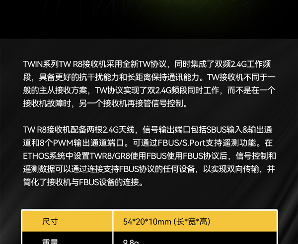 FrSky 睿思凯 TW R8 双2.4GHz频段接收机 8CH PWM通道